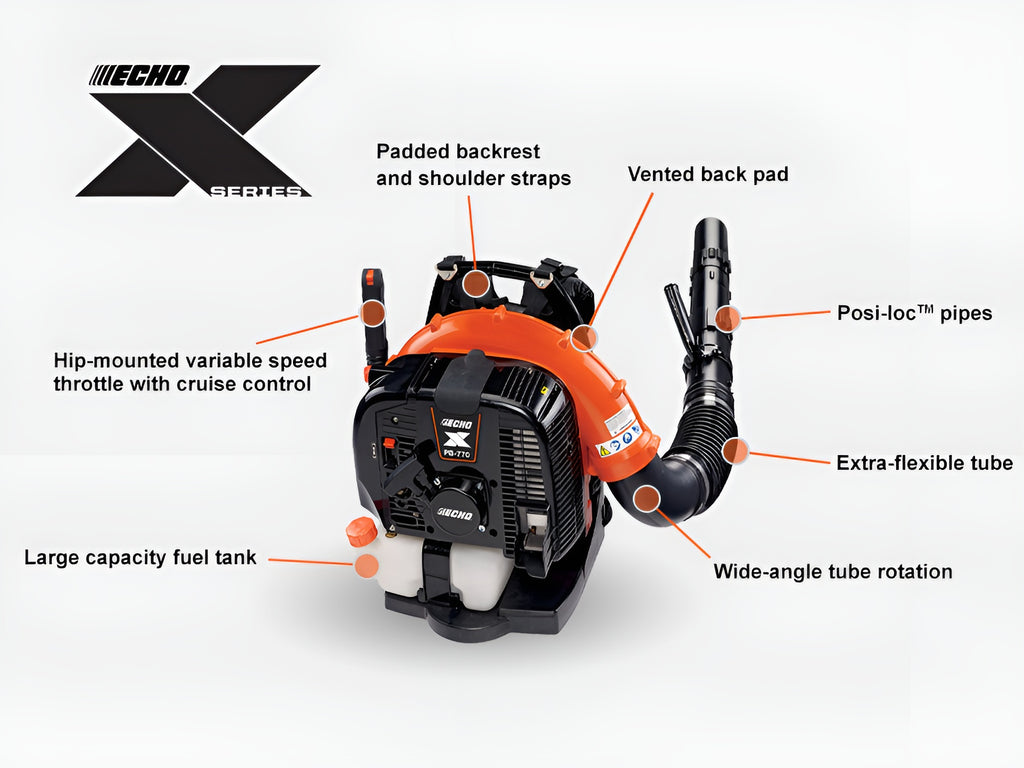 The industry's best combination of air speed and air volume, the PB-770H backpack blower with hip-mounted throttle is professionally productive, moving an astounding 756 CFM at 234 MPH. With ergonomic features like an ECHO-exclusive vented back pad for keeping cool in hot weather, it's truly a pro's best friend.