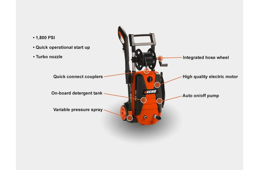 An effortless, powerful clean. The PWE-1800 pressure washer plugs in to power through years of dirt and grime in seconds. With variable cleaning force up to 1,800 PSI, it provides the versatility to clean decks, sidewalks, driveways, windows, bricks, siding, car wheels and more.
