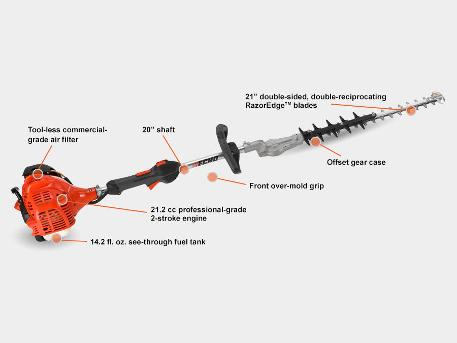 The SHC-225S hedge trimmer features an offset gear case and 20-in. shaft to add reach without compromising maneuverability. With easy starting, reduced vibration and ergonomic design, it keeps user fatigue to a minimum.